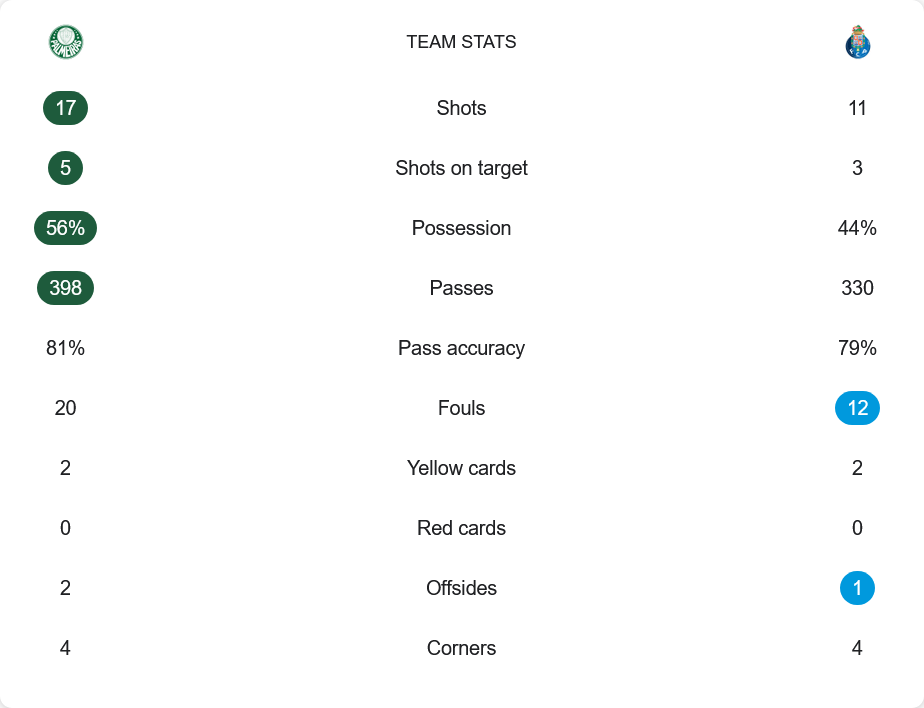 พัลไมรัสมีโอกาสยิงทั้งหมด 17 ครั้ง เข้ากรอบ 5 ขณะที่ปอร์โต้ยิง 11 ครั้ง เข้ากรอบ 3 พัลไมรัสครองบอลได้มากกว่าที่ 56% และจ่ายบอลได้ถึง 398 ครั้งด้วยความแม่นยำ 81% ด้านปอร์โต้จ่ายบอล 330 ครั้งแม่นยำ 79% เกมนี้มีฟาวล์รวม 32 ครั้ง โดยพัลไมรัสฟาวล์ 20 ครั้ง และปอร์โต้ฟาวล์ 12 ครั้ง ทั้งสองทีมได้รับใบเหลืองฝั่งละ 2 ใบ และมีลูกเตะมุมเท่ากันที่ 4 ลูก พัลไมรัสล้ำหน้า 2 ครั้ง ส่วนปอร์โต้ล้ำหน้า 1 ครั้ง