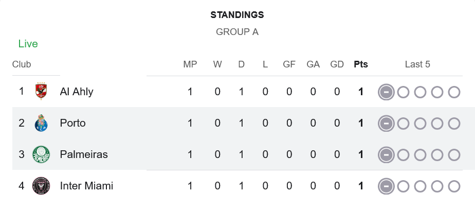 หลังเกมนี้กลุ่ม A กลายเป็นกลุ่มที่สมดุลแบบสุดๆ เมื่อทั้ง 4 ทีมต่างเก็บได้คนละ 1 แต้มจากการเสมอทั้งหมด ทำให้แต้มและผลต่างประตูได้เสียยังเท่ากันหมดทั้งพัลไมรัส, ปอร์โต้, อัล อาห์ลี และ อินเตอร์ ไมอามี่ ส่งผลให้เกมนัดที่ 2 ของแต่ละทีมจะกลายเป็นนัดชี้เป็นชี้ตายสำหรับการแย่งโควตาเข้ารอบอย่างแท้จริง