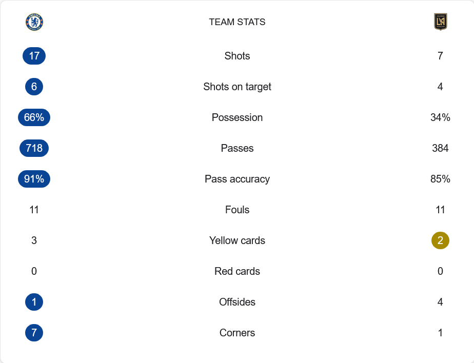 เกมนี้เชลซีครองบอลมากถึง 66% เทียบกับ LAFC ที่มีเพียง 34% เท่านั้น “สิงห์บลูส์” จ่ายบอลรวม 718 ครั้งด้วยความแม่นยำถึง 91% สร้างโอกาสยิงทั้งหมด 17 ครั้ง และยิงเข้ากรอบ 6 หน ส่วน LAFC ยิงเพียง 7 ครั้ง เข้ากรอบ 4 ครั้ง แม้จำนวนฟาวล์จะเท่ากันที่ 11 ครั้ง แต่เชลซีโดนใบเหลือง 3 ใบ ขณะที่ LAFC เสียไป 2 ใบ เชลซีได้เตะมุมมากถึง 7 ครั้ง เทียบกับ LAFC ที่ได้แค่ 1 ครั้งเท่านั้น