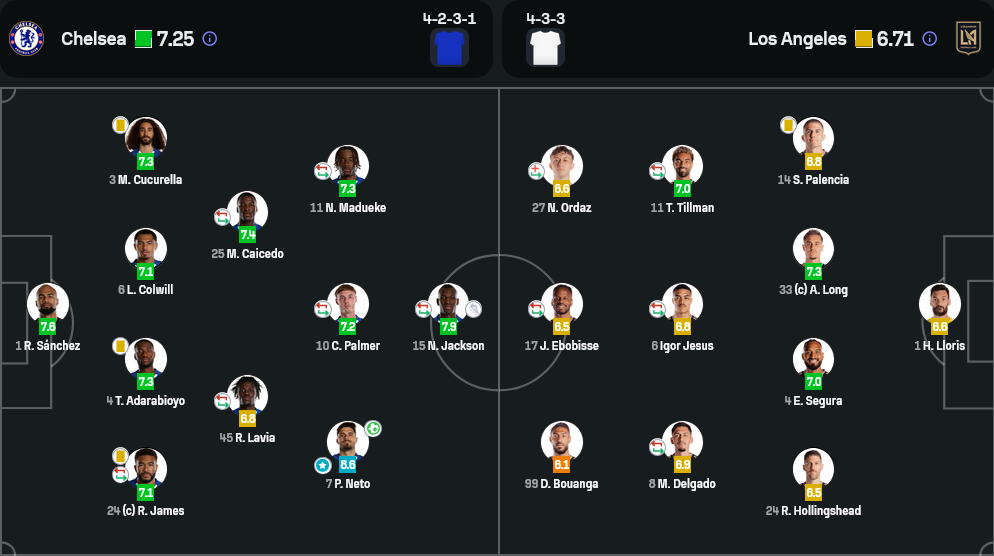- กองหลัง: รีซ เจมส์ (7.1) (C), โทซิน อดาราบิโอโย (7.3), ลีวาย โคลวิลล์ (7.1), มาร์ค กูกูเรญ่า (7.3)