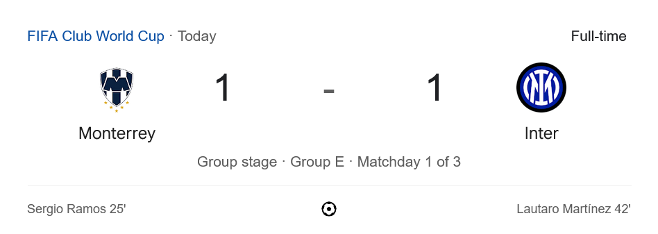 เกมแรกของกลุ่ม E ในศึก ฟีฟ่า คลับ เวิลด์ คัพ 2025 ดุเดือดตั้งแต่ต้นจนจบ เมื่อ มอนเทอร์เรย์ ตัวแทนจากเม็กซิโก เปิดเกมรับอย่างมีวินัยพร้อมสวนกลับเฉียบขาด ก่อนเสมอกับ อินเตอร์ มิลาน แชมป์โคปปา อิตาเลีย จากอิตาลีไปแบบสนุก 1-1 ในแมตช์ที่ทั้งสองทีมต่างแสดงให้เห็นถึงแท็กติกระดับท็อป พร้อมการต่อสู้ที่ดุดัน และมีจังหวะเข้าทำจบสกอร์สลับกันอย่างเร้าใจตลอด 90 นาที ซึ่งจาก ผลบอลสด ที่ออกมา ก็สะท้อนความสมดุลของเกมได้อย่างชัดเจน