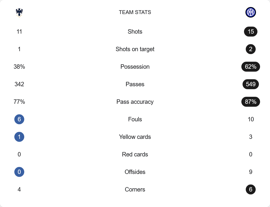 แม้อินเตอร์จะเป็นฝ่ายครองบอลมากถึง 62% และผ่านบอลมากถึง 549 ครั้ง ด้วยความแม่นยำ 87% เทียบกับมอนเทอร์เรย์ที่ครองบอลเพียง 38% และผ่านบอลแค่ 342 ครั้ง แต่ประตูและจังหวะลุ้นที่ชัดเจนกลับเป็นของมอนเทอร์เรย์มากกว่า อินเตอร์มีโอกาสยิงทั้งหมด 15 ครั้ง เข้ากรอบแค่ 2 ส่วนมอนเทอร์เรย์ยิง 11 ครั้ง เข้ากรอบเพียง 1 แต่ก็เปลี่ยนเป็นประตูได้ ด้านเกมปะทะอินเตอร์มีใบเหลืองถึง 3 ใบ เทียบกับฝั่งเจ้าบ้านที่มีเพียง 1 ใบเท่านั้น