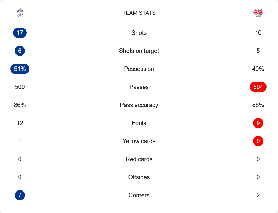 แม้ปาชูก้าจะครองบอลมากกว่าเล็กน้อยที่ 51% ต่อ 49% แต่จำนวนโอกาสยิงก็สูงถึง 17 ครั้ง เข้ากรอบ 6 ครั้ง ขณะที่ซัลซ์บวร์กยิงน้อยกว่าเพียง 10 ครั้งแต่เข้ากรอบถึง 5 ครั้งและเปลี่ยนเป็น 2 ประตูเต็ม ๆ ทั้งสองทีมจ่ายบอลในระดับใกล้เคียงกัน ปาชูก้าจ่าย 500 ครั้ง ความแม่นยำ 86% ส่วนซัลซ์บวร์ก 504 ครั้ง แม่นยำเท่ากันที่ 86% ปาชูก้ามีลูกเตะมุม 7 ครั้งมากกว่าซัลซ์บวร์กที่ได้เพียง 2 แต่เกมรุกของทีมเยือนเฉียบขาดกว่าชัดเจน