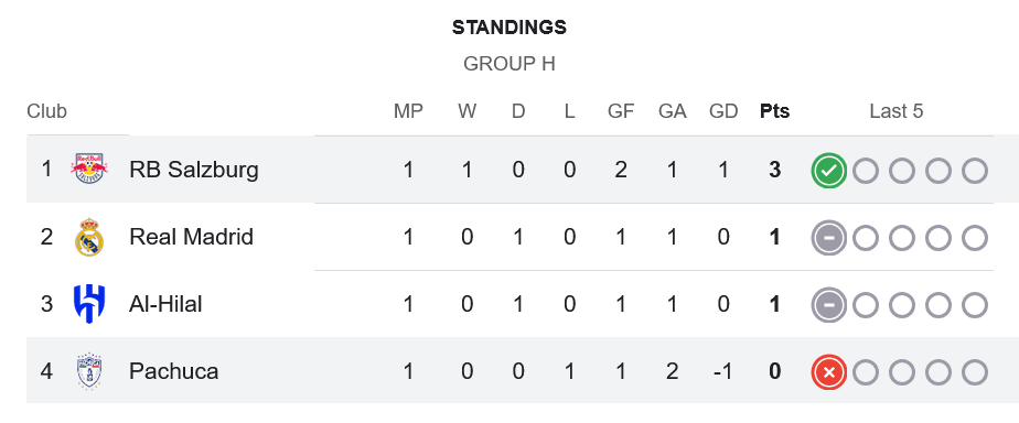 หลังจบเกมนัดแรก ซัลซ์บวร์กขึ้นจ่าฝูงกลุ่ม H ด้วย 3 แต้มเต็มจากชัยชนะนัดนี้ ส่วนปาชูก้ายังไม่มีแต้มและหล่นไปอยู่บ๊วย ขณะที่เรอัล มาดริด กับ อัล ฮิลาล มีทีมละ 1 คะแนนจากการเสมอกัน ทำให้เกมนัดถัดไปมีความหมายอย่างยิ่งในแง่ของการลุ้นเข้ารอบ