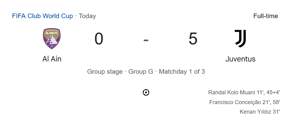 เกมประเดิมสนามของกลุ่ม G ในศึก ฟีฟ่า คลับ เวิลด์คัพ 2025 จบลงด้วยความพังพินาศของตัวแทนจากเอเชียอย่าง อัล ไอน์ ที่โดนโหมกระหน่ำโดย ยูเวนตุส จนสกอร์ขาดลอย 0-5 ชนิดที่แฟนบอลสาย ผลบอลสด ต้องตะลึงกับความเด็ดขาดของม้าลายแดนอิตาลี ซึ่งโชว์ให้เห็นว่าพวกเขาเอาจริงกับถ้วยนี้แค่ไหน
