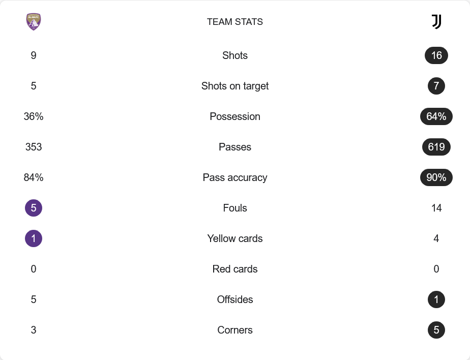 ยูเวนตุสเป็นฝ่ายครองเกมเหนือกว่าชัดเจน ครองบอล 64% เทียบกับ 36% ของอัล ไอน์ และยังผ่านบอลมากถึง 619 ครั้ง ด้วยความแม่นยำถึง 90% ขณะที่อัล ไอน์จ่ายเพียง 353 ครั้ง แม่นยำ 84% ยูเว่มีโอกาสยิงถึง 16 ครั้ง เข้ากรอบ 7 ส่วนอัล ไอน์ ยิง 9 ครั้ง เข้ากรอบ 5 แม้จะไม่ต่างกันมากในเรื่องโอกาส แต่ยูเว่เปลี่ยนเป็นประตูได้อย่างเฉียบคม ความแตกต่างที่ชัดที่สุดคือความแม่นยำในจังหวะสุดท้าย ยูเวนตุสฟาวล์มากถึง 14 ครั้ง และได้เตะมุม 5 ครั้ง ส่วนอัล ไอน์ได้เพียง 3 ครั้ง และเสียใบเหลืองไปหนึ่งใบ