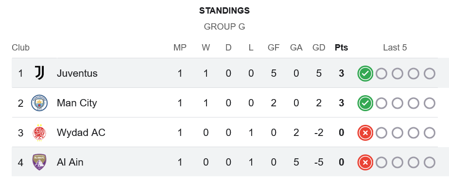 ยูเวนตุสเก็บ 3 แต้มเต็ม พร้อมขึ้นนำจ่าฝูงกลุ่ม G ด้วยผลต่างประตูได้เสีย +5 ขณะที่ แมนเชสเตอร์ ซิตี้ ก็มี 3 แต้มเช่นกันแต่ผลต่างประตูได้แค่ +2 ส่วน วีแดด กับ อัล ไอน์ รั้งอันดับ 3 และ 4 ตามลำดับ โดยอัล ไอน์ต้องเร่งเต็มที่หากหวังผ่านเข้ารอบจากกลุ่มนี้ เพราะต้องเจอกับแมนฯ ซิตี้ในนัดหน้า