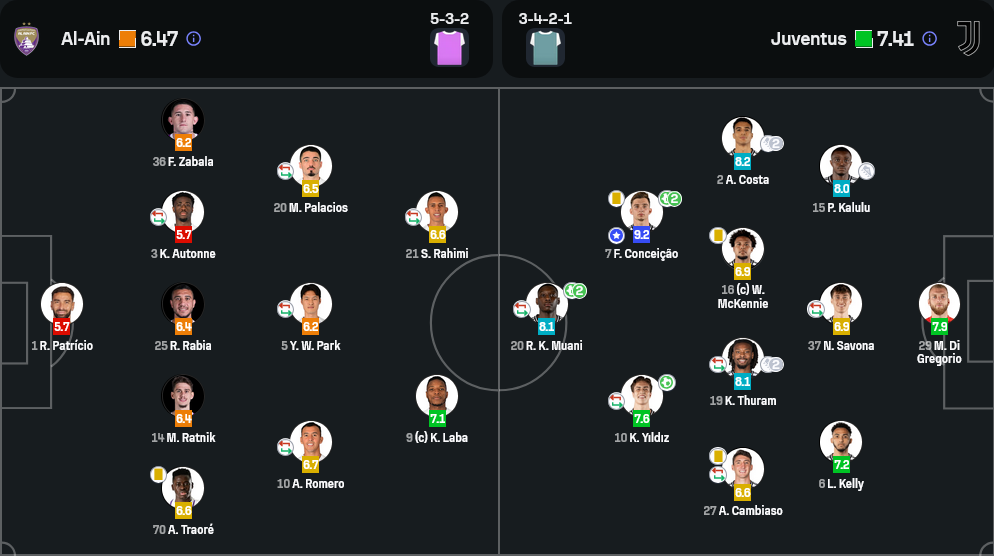 ในฝั่งยูเวนตุส แผน 3-4-2-1 ของอิกอร์ ทูดอร์นั้นเล่นได้สมบูรณ์แบบทุกมิติ มีการเชื่อมต่อระหว่างวิงแบ็คกับเพลย์เมกเกอร์ดีเยี่ยม การวิ่งทำทางของ คอนไซเซา กับ ยิลดิซ ทำให้แนวรับของอัล ไอน์ปั่นป่วนอยู่ตลอด และเมื่อบวกกับความเฉียบคมของ โคโล มูอานี่ และมิดฟิลด์ที่ยิงเองได้ เกมนี้จึงเป็นตัวอย่างของการ วิเคราะห์บอล ที่แสดงให้เห็นถึงทีมที่มีทั้งระบบและนักเตะที่พร้อมรบในทุกพื้นที่ของสนาม
