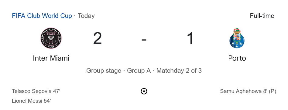 จาก : ผลบอลสด ฟีฟ่าคลับเวิลด์คัพ ชิงแชมป์สโมสรโลก ระหว่าง อินเตอร์ ไมอามี ซีเอฟ 2-1 ปอร์โต้ วันนี้ 20/6/68 – บ้านกีฬา