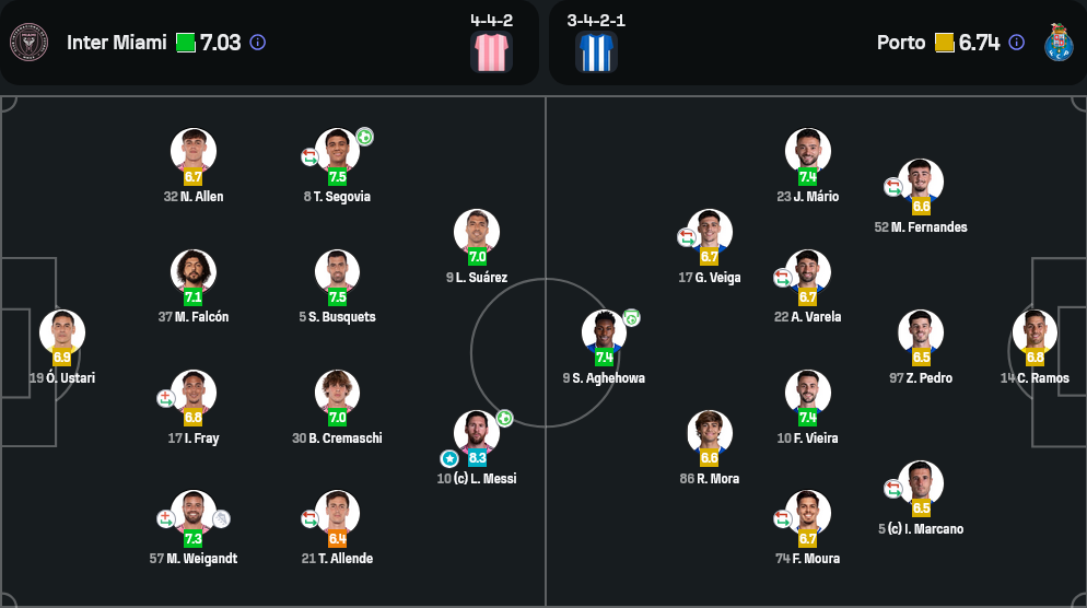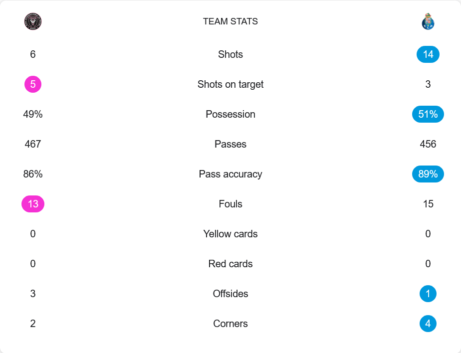 แม้ปอร์โต้จะเป็นฝ่ายมีโอกาสยิงมากกว่าถึง 14 ครั้ง เทียบกับอินเตอร์ ไมอามีที่ยิงแค่ 6 ครั้ง แต่ลูกทีมของ มาสเคราโน่ กลับมีประสิทธิภาพในการจบสกอร์ดีกว่า โดยยิงเข้ากรอบถึง 5 ครั้ง ขณะที่ปอร์โต้ยิงเข้ากรอบเพียง 3 จาก 14 ครั้ง แม้สถิติครองบอลจะใกล้เคียงกัน (ไมอามี 49% ปอร์โต้ 51%) แต่การต่อบอลและความแม่นยำ ปอร์โต้ทำได้ดีกว่าเล็กน้อยที่ 89% เทียบกับไมอามี 86% จำนวนฟาวล์รวมทั้งสองทีมมีเยอะพอสมควรคือ 13 กับ 15 แต่ไม่มีใบเหลืองหรือใบแดงเลยในเกมนี้ ทำให้เกมค่อนข้างเปิดและเร้าใจจนจบ