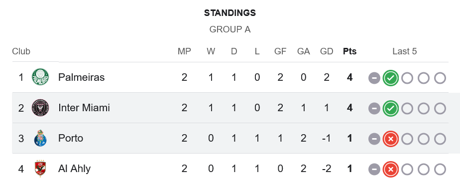 ในแมตช์สุดท้ายของกลุ่ม A ตาม ตารางบอล วันที่ 24 มิถุนายน 2568 อินเตอร์ ไมอามี ต้องเจอกับงานช้างเมื่อจะดวลกับ พัลไมรัส โดยเป็นศึกตัดสินจ่าฝูงกลุ่ม ขณะที่ ปอร์โต้ ต้องเอาชนะ เอล อาห์ลี ให้ได้เพื่อลุ้นเข้ารอบ และต้องภาวนาให้ผลอีกคู่เป็นใจด้วยเช่นกัน