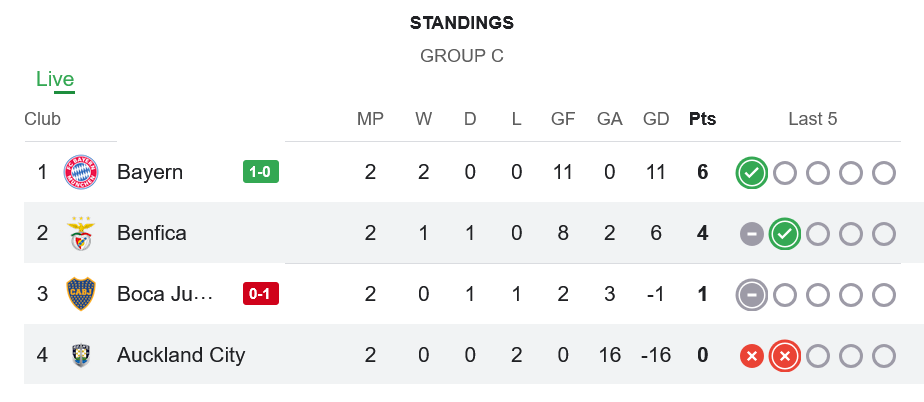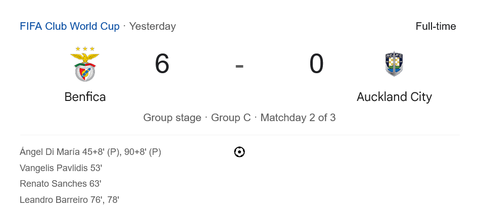 ชัยชนะนัดนี้ทำให้เบนฟิก้ามีเพิ่มเป็น 4 คะแนน จาก 2 นัด รั้งอันดับ 2 ของกลุ่ม C ตามหลัง บาเยิร์น มิวนิค ที่เก็บ 6 แต้มเต็มหลังถล่มโอคแลนด์ 10-0 และชนะเบนฟิก้าอีกนัด ส่วน โอคแลนด์ ซิตี้ แพ้รวด 2 นัด ยิงไม่ได้ เสียไป 16 ลูก ตกรอบเรียบร้อยแน่นอนแล้ว ด้าน โบคา จูเนียร์ส ที่เสมอกับเบนฟิก้า 2-2 มี 1 คะแนน ต้องชนะนัดสุดท้ายกับโอคแลนด์ และลุ้นให้เบนฟิก้าไม่ชนะบาเยิร์น เพื่อมีโอกาสเข้ารอบ