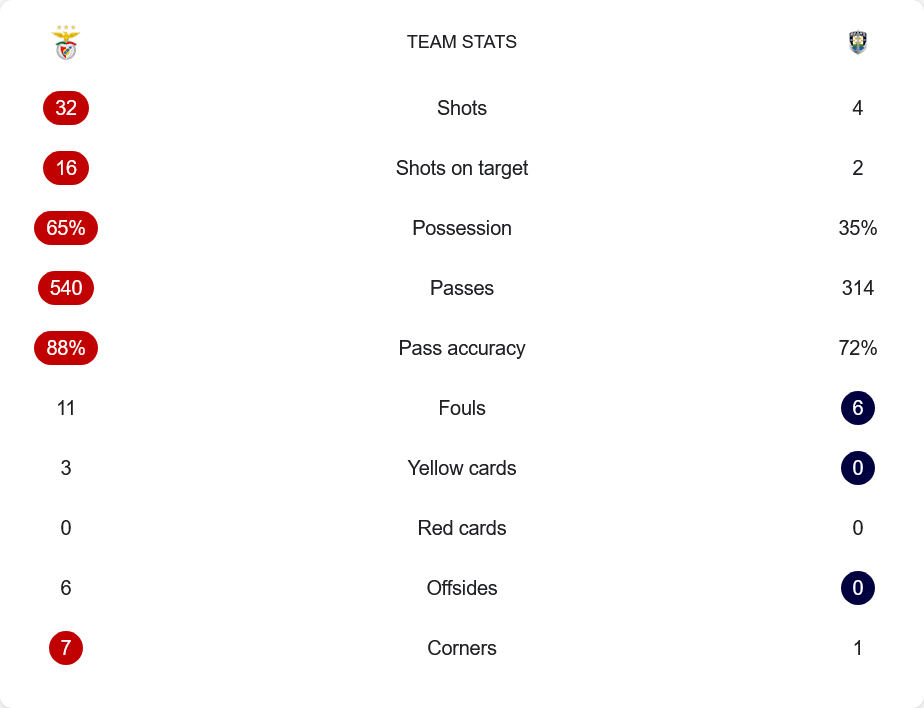 เกมเริ่มต้นอย่างกดดันจากฝั่งเบนฟิก้าที่ตั้งเกมบุกใส่ทันที และมาได้ประตูขึ้นนำ 1-0 ในช่วงทดเวลาบาดเจ็บครึ่งแรก นาทีที่ 45+8 จากจุดโทษของ Ángel Di María ปีกจอมเก๋าที่รับหน้าที่สังหารไม่พลาด ครึ่งหลังเกมยังเป็นของเบนฟิก้าแบบเบ็ดเสร็จ นาที 53 Vangelis Pavlidis ซัดประตูที่สองจากการประสานงานกับ Orkun Kökçü ถัดมาอีกสิบกว่านาที Renato Sanches ตัวสำรองยิงไกลสุดงามนาที 63 ก่อนที่ Leandro Barreiro จะระเบิดฟอร์มร้อนแรงยิงเบิ้ลสองลูกในนาที 76 และ 78 ปิดท้ายด้วยจุดโทษลูกที่สองของ Di María ในช่วงทดเจ็บนาที 90+8 สรุปจบเกมถล่มยับ 6-0 พร้อมสถิติ ผลบอลสด ที่ขาดลอยอย่างแท้จริง