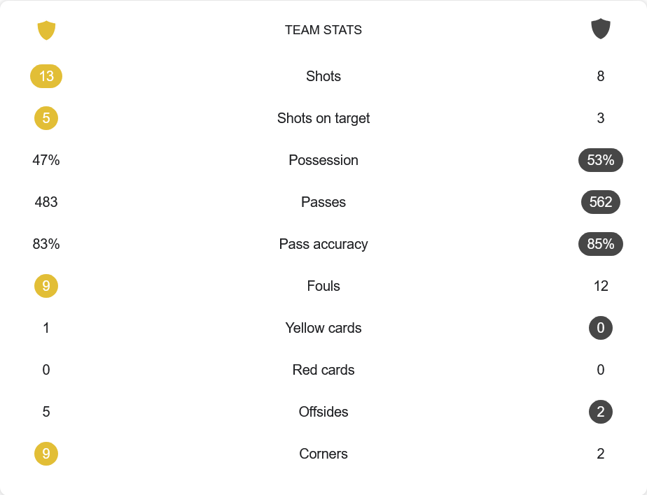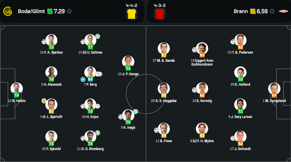 บรานน์แม้จะครองบอลมากกว่า 53% และจ่ายบอลแม่นยำกว่าที่ 85% จากจำนวนผ่านบอล 562 ครั้ง แต่การเข้าทำกลับด้อยกว่า โบโด กลิมท์ ที่มีโอกาสยิงมากถึง 13 ครั้ง เข้ากรอบ 5 ครั้ง และยิงได้ถึง 3 ประตู ต่างจากบรานน์ที่ยิงแค่ 8 ครั้ง เข้ากรอบเพียง 3 โอกาส ฟาวล์เกิดขึ้นรวม 21 ครั้ง เกมเปิดและมีการปะทะเยอะ ทั้งสองทีมไม่มีใบแดง ขณะที่บรานน์โดนใบเหลืองไปเพียง 1 ใบ ด้านลูกเตะมุมเจ้าบ้านได้มากถึง 9 ครั้ง เทียบกับทีมเยือนที่ได้แค่ 2 ครั้ง สะท้อนการกดดันต่อเนื่องของเจ้าถิ่น