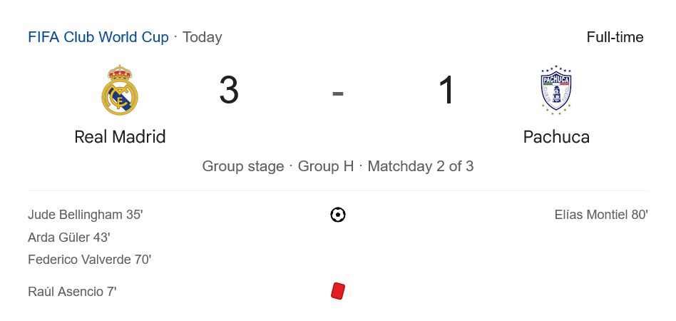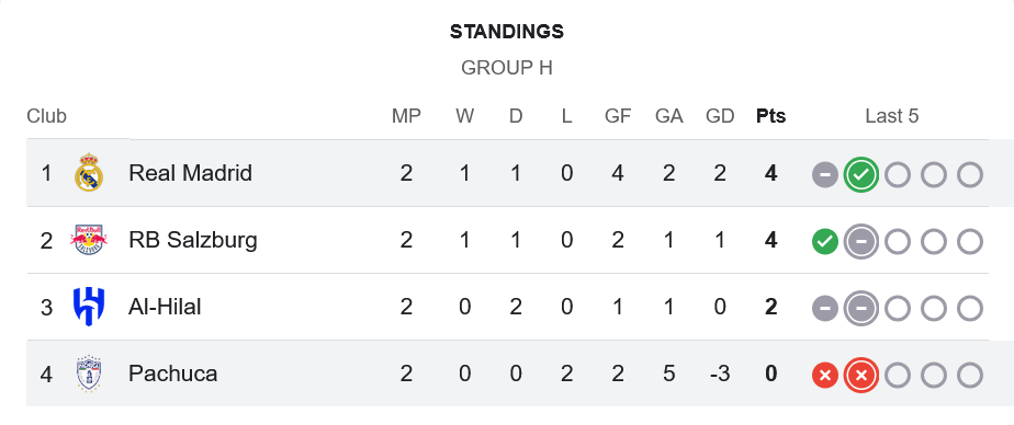 ตาม ตารางบอล กลุ่ม H นัดสุดท้าย เรอัล มาดริดจะเจอกับ อาร์เบ ซัลซ์บวร์ก ในวันที่ 27 มิถุนายน เวลา 08:00 น. ซึ่งเป็นเกมตัดสินแชมป์กลุ่มแน่นอน ด้านปาชูก้าจะพบกับ อัล ฮิลาล ซึ่งหมดลุ้นทั้งคู่