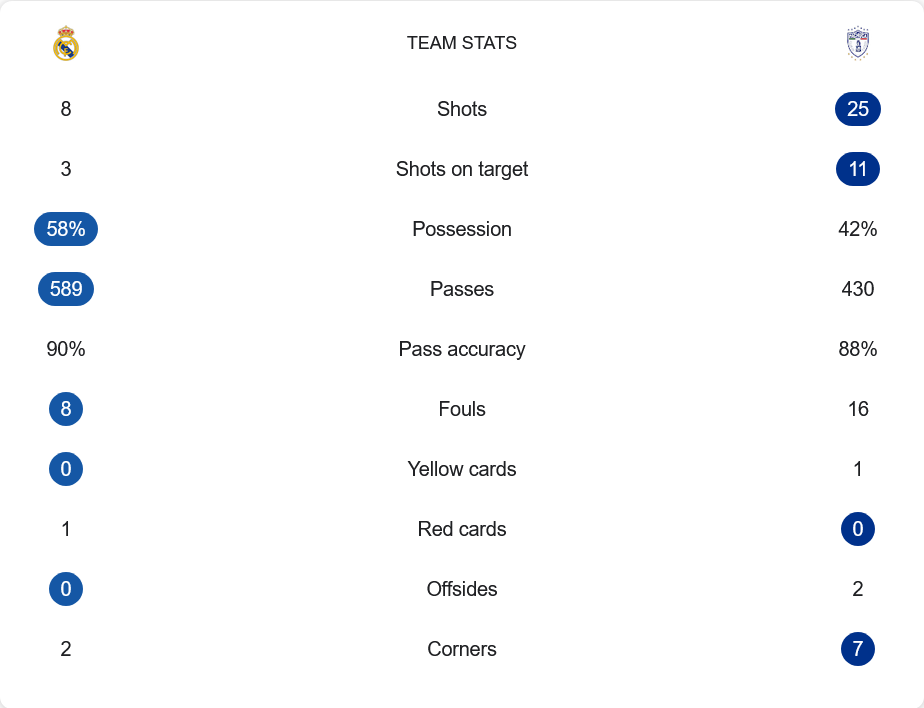 แม้เรอัล มาดริดจะเป็นฝ่ายได้ยิงเพียง 8 ครั้ง และเข้ากรอบ 3 ครั้ง แต่ทุกครั้งคือความเฉียบคมที่เปลี่ยนเป็น 3 ประตูเต็มรูปแบบ ขณะที่ปาชูก้ามีโอกาสยิงถึง 25 ครั้ง เข้ากรอบ 11 ครั้ง แต่ถูกติโบต์ กูร์ตัวส์ ปฏิเสธแบบไร้เยื่อใย ความแม่นยำในการจ่ายบอลของมาดริดสูงถึง 90% จากจำนวน 589 ครั้ง โดยครองบอลมากกว่าอยู่ที่ 58% ทำฟาวล์ 8 ครั้ง และไม่มีใบเหลือง ขณะที่ปาชูก้าครองบอล 42% จ่ายบอลแม่น 88% ทำฟาวล์ถึง 16 ครั้ง และได้ใบเหลือง 1 ใบ รวมถึงมีโอกาสได้เตะมุมถึง 7 ครั้งแต่ไร้ประโยชน์