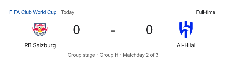 การแข่งขันศึก ฟีฟ่าคลับเวิลด์คัพ กลุ่ม H นัดที่สอง เร้ดบูลล์ ซัลซ์บวร์ก และ อัล ฮิลาล สู้กันอย่างเข้มข้นแต่ไม่มีฝ่ายใดเจาะตาข่ายกันได้ จบเกมเสมอกันไป 0-0 ท่ามกลางเกมที่มีโอกาสทั้งสองฝั่งแต่ขาดความเฉียบคมในพื้นที่สุดท้าย สำหรับแฟนๆ ที่ติดตาม ผลบอลสด คู่นี้ต่างบอกเป็นเสียงเดียวกันว่าเป็นแมตช์ที่เปี่ยมแท็กติก เต็มไปด้วยความดุเดือด และผู้รักษาประตูต่างโชว์ฟอร์มเหนียวหนึบ