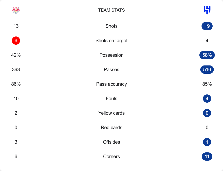เกมนี้อัล ฮิลาลเป็นฝ่ายครองบอลมากกว่าด้วยเปอร์เซ็นต์ถึง 58% และจ่ายบอลทั้งหมด 516 ครั้งด้วยความแม่นยำ 85% ต่างจากซัลซ์บวร์กที่ครองบอลเพียง 42% แต่มีจังหวะเข้าทำที่ชัดเจนพอสมควร โดยยิงรวม 13 ครั้ง ตรงกรอบ 6 ครั้ง เท่ากับจำนวนเซฟของโบโน่ ขณะที่ฮิลาลมีโอกาสยิง 19 ครั้ง แต่ตรงกรอบเพียง 4 ครั้งเท่านั้น จุดที่น่าสนใจคือการที่ซัลซ์บวร์กได้ใบเหลืองถึง 2 ใบ จากจังหวะฟาวล์ที่หนักพอสมควร ขณะที่ฮิลาลไม่เสียใบเหลืองแม้แต่ใบเดียวตลอดเกม