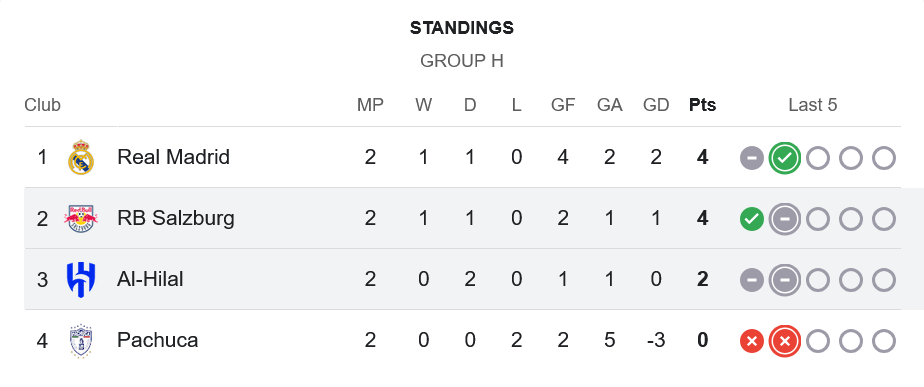 ตาม ตารางบอล กลุ่ม H นัดสุดท้าย อัล ฮิลาลจะพบกับปาชูก้า วันที่ 27 มิถุนายน เวลา 08:00 น. ซึ่งถือเป็นเกมชี้ชะตาสำหรับทีมจากซาอุฯ ด้านซัลซ์บวร์กต้องเจอกับของแข็งอย่างเรอัล มาดริดในวันเดียวกัน ซึ่งหากพลาดแต้มอาจโดนฮิลาลแซงเข้ารอบทันที