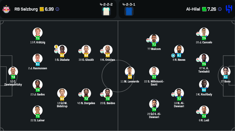 ซัลซ์บวร์กยังคงใช้ระบบ 4-2-2-2 ตามสไตล์ที่ถนัด ซึ่งเน้นการขึ้นเกมจากริมเส้นแล้วสลับเข้ากลาง ความโดดเด่นของเกมรับอยู่ที่ราสมุสเซนและซาวีชิทซ์กี้ที่ช่วยกันป้องกันได้อย่างยอดเยี่ยม อย่างไรก็ตาม เกมรุกของซัลซ์บวร์กยังขาดไอเดียในจังหวะสุดท้าย ไม่มีตัวที่เปลี่ยนเกมได้ชัดเจน ทำให้ไม่สามารถเจาะแนวรับอัล ฮิลาลที่เล่นได้แน่นหนา
