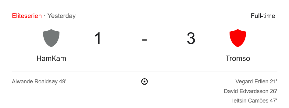 แม้ฮามคัมจะมีโอกาสตีไข่แตกและเริ่มเร่งเกมมากขึ้น ในที่สุดก็มายิงประตูปลอบใจได้ในนาที 49 จากลูกยิงของ อัลวันเด้ โรอัลด์ซอย ช่วยให้ไล่มาเป็น 1-3 แต่ก็ไม่สามารถไล่คืนมากกว่านี้ได้ จบเกม ทรอมโซ่ บุกชนะ ฮามคัม อย่างเด็ดขาด 3-1 พร้อมโชว์ ฟอร์มสดบนบ้านผลบอล