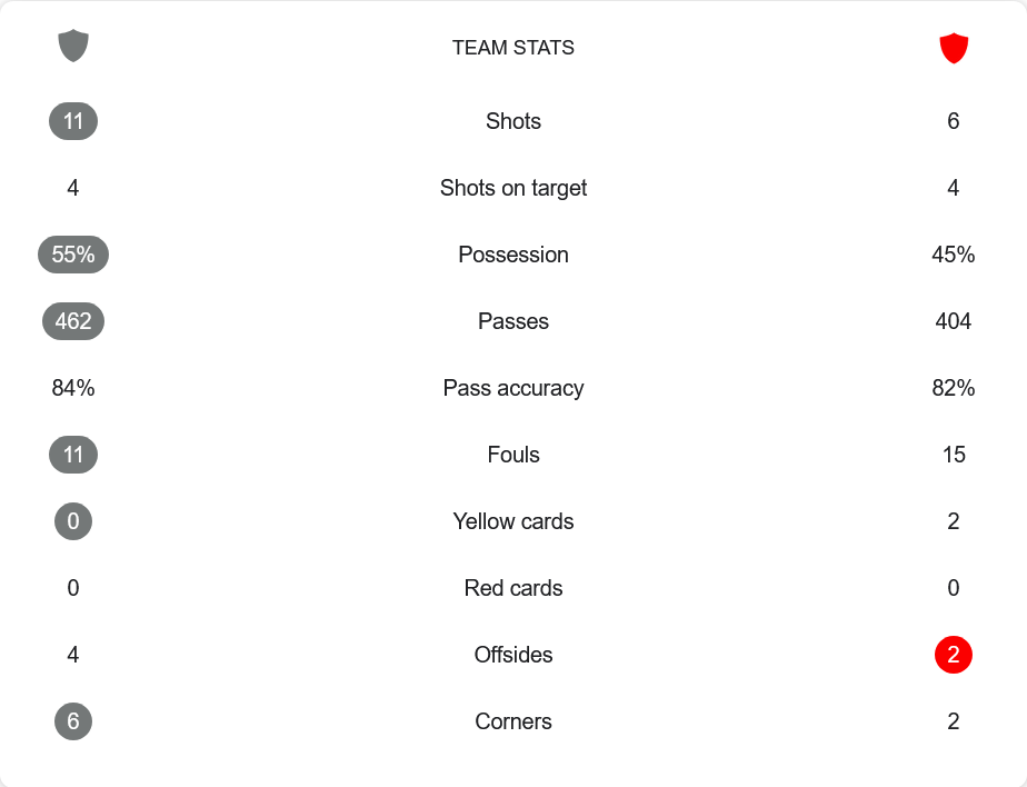 แม้ ฮามคัม จะมีเปอร์เซ็นต์ครองบอลมากถึง 55% และจ่ายบอลสำเร็จ 84% จากทั้งหมด 462 ครั้ง แต่คุณภาพการเข้าทำยังน้อย ยิงตรงกรอบได้เพียง 4 จาก 11 ครั้ง ต่างจากทรอมโซ่ที่ครองบอล 45% แต่สร้างจังหวะได้อย่างมีประสิทธิภาพ ยิง 6 ครั้งเข้ากรอบถึง 4 หนและเปลี่ยนเป็น 3 ประตู ขณะที่เกมรับทั้งสองทีมฟาล์วรวมกัน 26 ครั้ง แต่ทรอมโซ่ได้เหลือง 2 ใบ แสดงให้เห็นถึงเกมรับที่ดุดันกว่า ฮามคัมมีโอกาสจากลูกเตะมุมมากถึง 6 ครั้งแต่เปล่าประโยชน์ ขณะที่ทรอมโซ่มีเพียง 2 ครั้งเท่านั้นแต่เปลี่ยนเป็นประตูได้