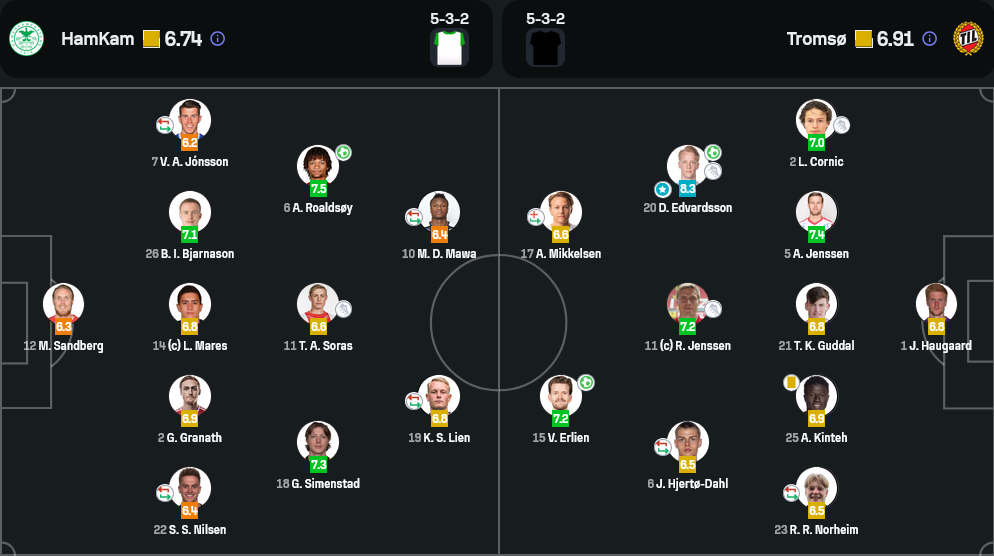วิเคราะห์บอล จากแผนการเล่น 5-3-2 ของทั้งสองทีม รูปเกมของ ทรอมโซ่ ทำได้ดีกว่าในทุกมิติ โดยใช้มิดฟิลด์อย่าง เอ็ดวาร์ดส์สัน เป็นตัวเชื่อมเกมที่เด็ดขาด การขึ้นเกมทางฝั่งซ้ายผ่านคอร์นิชและเจนส์เซ่นมีความเร็วและประสิทธิภาพสูง ขณะที่แนวรับยืนตำแหน่งดีและรับมือกับลูกกลางอากาศได้ดี ต่างจาก ฮามคัม ที่แม้จะเน้นครองบอลแต่เล่นบอลช้าและขาดจังหวะทะลุเกมรับคู่แข่ง การตั้งรับของฮามคัมยังเปิดพื้นที่เยอะ จึงทำให้โดนสวนกลับหลายครั้ง และเสียประตูแบบง่ายๆ วิเคราะห์จากภาพรวมแล้ว ทรอมโซ่สมควรเป็นผู้ชนะจากแผนที่เฉียบขาดกว่า