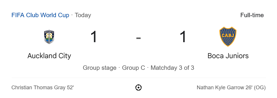 ศึกฟีฟ่าคลับเวิลด์คัพ 2025 กลุ่ม C นัดสุดท้าย ทีมรองบ่อนจากโอเชียเนียอย่าง โอคแลนด์ ซิตี้ สร้างผลงานสุดแกร่งยันเสมอยักษ์ใหญ่จากอาร์เจนตินา โบคา จูเนียร์ส 1-1 แบบสุดมันส์ แม้จะโดนบุกถล่มตลอดทั้งเกม แต่พวกเขาก็สามารถแชร์แต้มได้อย่างน่าเหลือเชื่อ ซึ่งผล ผลบอลสด สุดดราม่านี้ส่งผลให้ทั้งสองทีมตกรอบไปพร้อมกันในกลุ่ม C