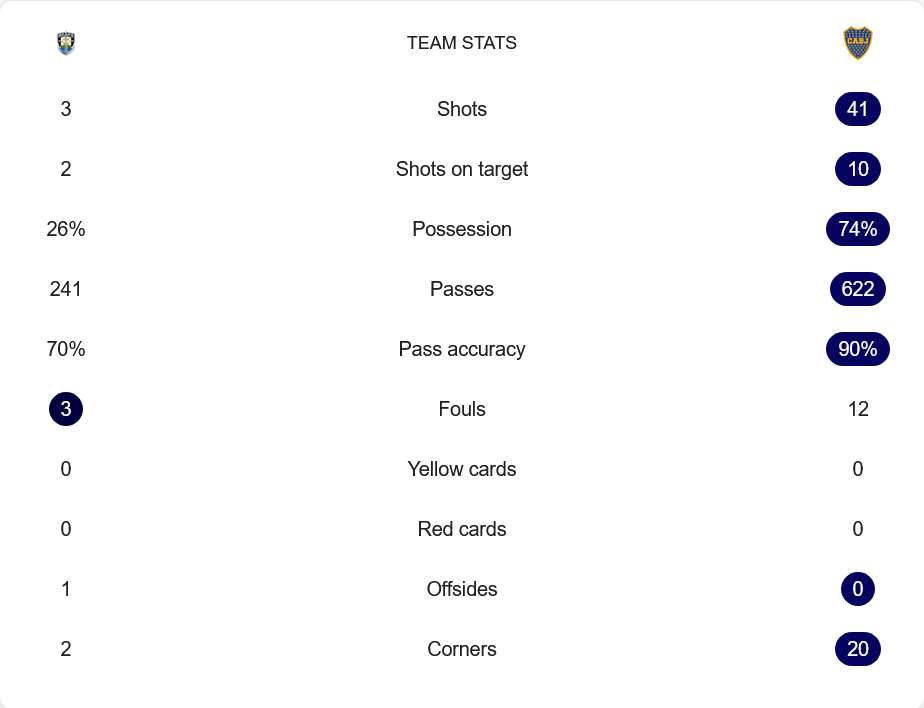 โบคา จูเนียร์สครองบอลได้มากถึง 74% เทียบกับโอคแลนด์ ซิตี้ ที่มีเพียง 26% เท่านั้น โบคามีโอกาสยิงถึง 41 ครั้ง เข้ากรอบ 10 ครั้ง และได้ลูกเตะมุมถึง 20 ครั้ง ขณะที่โอคแลนด์ยิงเพียง 3 ครั้ง เข้ากรอบ 2 ครั้ง แม้จำนวนน้อยแต่มีประสิทธิภาพสูง โดยเฉพาะจังหวะประตูตีเสมอ นอกจากนี้ทั้งสองทีมไม่มีใบเหลืองหรือใบแดงในเกมนี้ และเล่นกันได้อย่างแฟร์เพลย์