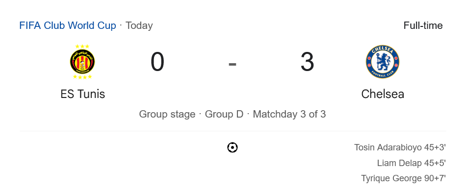 ผลบอลสด นัดสุดท้ายของกลุ่ม D ศึกฟีฟ่าคลับเวิลด์คัพ 2025 ระหว่าง เอสเปรานซ์ เอสที ยอดทีมจากตูนิเซีย พบกับ เชลซี ขุนพลจากพรีเมียร์ลีกอังกฤษ กลายเป็นฝันร้ายของแฟนบอลแอฟริกา เมื่อทีมสิงห์บลูส์ระเบิดฟอร์มไล่ถล่ม 3-0 แบบไม่ไว้หน้า ตีตั๋วเข้าสู่รอบต่อไปในฐานะรองแชมป์กลุ่มได้สำเร็จจากประตูของ อาดาราบิโอโย, เดลาป และ จอร์จ