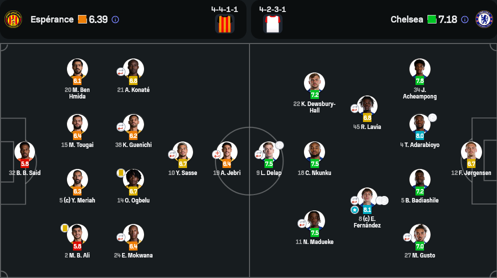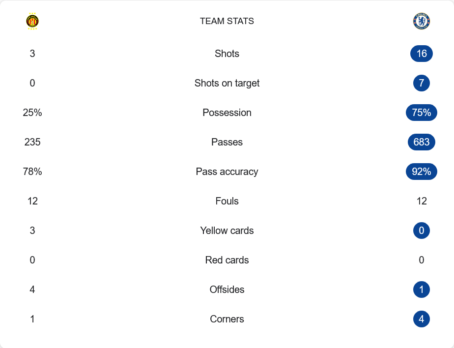 เชลซีเหนือกว่าแทบทุกมิติ พวกเขาครองบอลถึง 75% เทียบกับเอสเปรานซ์เพียง 25% มีการจ่ายบอลมากถึง 683 ครั้ง ด้วยความแม่นยำถึง 92% ส่วนฝั่งทีมจากตูนิเซียจ่ายไปเพียง 235 ครั้งแม่นยำ 78% ทั้งสองทีมฟาวล์เท่ากันที่ 12 ครั้ง แต่เอสเปรานซ์โดนใบเหลืองถึง 3 ใบ ขณะที่เชลซีไม่มีเลย ด้านการเข้าทำ สิงห์บลูส์ยิงไป 16 ครั้ง เข้ากรอบ 7 ครั้ง ส่วนเอสเปรานซ์ยิง 3 ครั้งไม่เข้ากรอบเลยแม้แต่ลูกเดียว