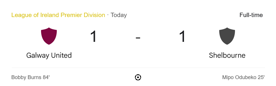 และในที่สุดความพยายามก็สัมฤทธิ์ผล นาที 84 Bobby Burns รับบอลจากจังหวะกดดันของกองกลางแล้วซัดประตูตีเสมออย่างเฉียบคมให้กัลเวย์ ยูไนเต็ด ไล่เจ๊าเป็น 1-1 ก่อนที่ช่วงท้ายเกมจะเดือดอีกรอบด้วยการฟาวล์และใบเหลืองแจกกันระนาว แต่สุดท้ายทั้งสองทีมไม่สามารถเปลี่ยนผลได้ จบเกมแบ่งแต้มไปด้วยสกอร์ 1-1