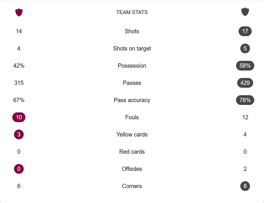 แม้เชลบอร์นครองบอลมากกว่าที่ 58% และจ่ายบอลได้ถึง 429 ครั้งด้วยความแม่นยำ 78% แต่เกมนี้พวกเขายิงได้เพียง 5 ครั้งเข้ากรอบ ขณะที่กัลเวย์ ยูไนเต็ดมีโอกาสยิง 14 ครั้ง เข้ากรอบ 4 ครั้ง ครองบอลเพียง 42% และจ่ายบอล 315 ครั้ง ความแม่นในการจ่ายบอลอยู่ที่ 67% เท่านั้น