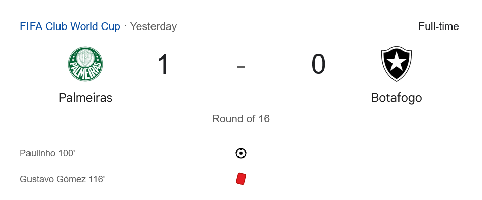ศึกฟุตบอล ฟีฟ่าคลับเวิลด์คัพ รอบ 16 ทีมสุดท้ายเดือดจัดกลางดึก! เมื่อ พัลไมรัส เปิดศึกสุดเข้มข้นกับ โบตาโฟโก้ คู่แข่งร่วมชาติจากบราซิล ผลจบลงด้วยชัยชนะเฉือนหวิวของพัลไมรัส 1-0 จากประตูสำคัญของ พอลินโญ่ นาที 100 ส่งทีมของ อาเบล เฟร์เรยร่า ลอยลำสู่รอบ 8 ทีมสุดท้าย พบกับเชลซี วันที่ 5 กรกฎาคม ขณะที่แฟนบอลที่ติดตาม ผลบอลสด ทั่วโลกต่างใจเต้นระทึกกับแมตช์ที่เต็มไปด้วยดราม่าทั้งใบแดง ใบเหลือง และการปะทะดุเดือด
