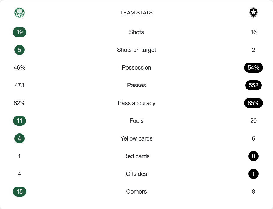 แม้พัลไมรัสจะยิงตรงกรอบมากกว่า 5 ต่อ 2 จากจำนวนยิงทั้งหมด 19 ครั้ง แต่โบตาโฟโก้กลับครองบอลได้ถึง 54% และจ่ายบอลแม่นยำถึง 85% เทียบกับ 82% ของพัลไมรัส อย่างไรก็ตาม พัลไมรัสได้ลูกเตะมุมถึง 15 ครั้ง เทียบกับ 8 ของโบตาโฟโก้ ส่วนใบเหลืองโบตาโฟโก้เสียถึง 6 ใบ ขณะที่พัลไมรัสมี 4 ใบ และ 1 ใบแดงจากโกเมซ ถือเป็นเกมที่ตึงเครียดแทบทุกจังหวะ