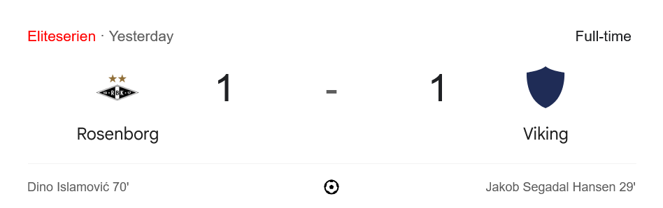 ศึกนอร์เวย์ ทิปเปลีเก้น เมื่อวันที่ 28 มิถุนายน 2568 จ่าฝูง ไวกิ้ง เอฟเค บุกเยือนทีมแกร่งอย่าง โรเซนบอร์ก ที่สนามเลอร์เคนดาล และแบ่งแต้มกันไปสุดมันด้วยผล 1-1 จากเกมที่เต็มไปด้วยจังหวะเข้าทำดุดันและการสู้กันแบบไม่มีใครยอมใคร เกมนี้ถือว่ามีผลต่ออันดับโดยตรง และแน่นอนว่าแฟนบอลที่ตามเช็ก ผลบอลสด ได้ลุ้นกันตั้งแต่นาทีแรกยันเสียงนกหวีดสุดท้าย