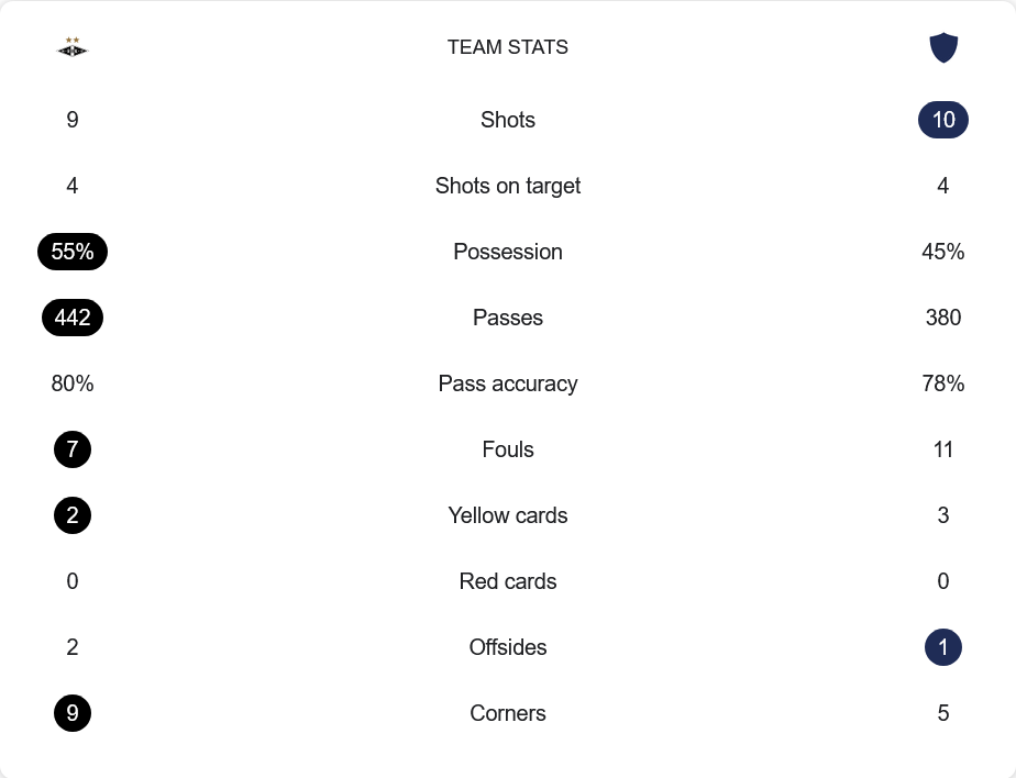 ตลอด 90 นาที โรเซนบอร์กมีเปอร์เซ็นต์ครองบอลอยู่ที่ 55% เหนือกว่าไวกิ้งที่ได้ 45% โดยทั้งสองทีมมีโอกาสยิงใกล้เคียงกันคือ 9 ครั้ง (โรเซนบอร์ก) และ 10 ครั้ง (ไวกิ้ง) และยิงเข้ากรอบ 4 ครั้งเท่ากัน การผ่านบอล โรเซนบอร์กจ่ายทั้งหมด 442 ครั้ง ความแม่นยำ 80% ขณะที่ไวกิ้งจ่าย 380 ครั้ง ความแม่นยำ 78% เกมนี้มีการฟาวล์รวมกันถึง 18 ครั้ง โรเซนบอร์กโดนใบเหลือง 2 ใบ ส่วนไวกิ้ง 3 ใบ โรเซนบอร์กได้ลูกเตะมุมมากถึง 9 ครั้ง ขณะที่ไวกิ้งได้ 5 ครั้ง