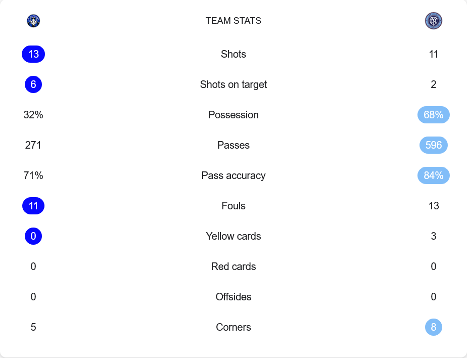 แม้นิวยอร์ก ซิตี้ เอฟซี จะครองบอลมากถึง 68% และผ่านบอลได้ถึง 596 ครั้ง ด้วยความแม่นยำ 84% แต่กลับมีโอกาสยิงเพียง 11 ครั้ง และเข้ากรอบแค่ 2 ครั้งเท่านั้น ขณะที่เจ้าถิ่นมอนทรีออลที่ครองบอลเพียง 32% แต่สร้างโอกาสยิงได้ถึง 13 ครั้ง และยิงเข้ากรอบ 6 ครั้งอย่างมีคุณภาพ ความแม่นยำในการผ่านบอลของมอนทรีออลอยู่ที่ 71% จากการจ่ายทั้งหมด 271 ครั้ง ฟาวล์รวม 24 ครั้ง โดยมอนทรีออลทำ 11 ครั้ง นิวยอร์ก 13 ครั้ง ใบเหลืองทั้งหมด 3 ใบเกิดขึ้นฝั่งทีมเยือน เตะมุมเกมนี้ นิวยอร์กได้ถึง 8 ครั้ง ขณะที่เจ้าบ้านได้ 5 ครั้ง