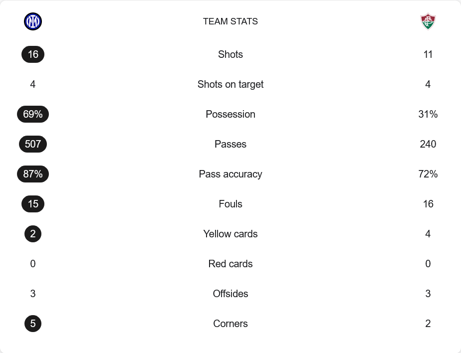 แม้อินเตอร์จะมีสถิติเหนือกว่าหลายด้าน ทั้งการครองบอล 69% ยิงทั้งหมด 16 ครั้ง และผ่านบอลรวม 507 ครั้ง แต่พวกเขากลับยิงตรงกรอบแค่ 4 หน ขณะที่ฟลูมิเนนเซ่มีโอกาสยิงน้อยกว่า (11 ครั้ง) แต่เปลี่ยนเป็นประตูได้ถึง 2 ลูก แถมยิงตรงกรอบทุกครั้งที่มีโอกาส สะท้อนถึงประสิทธิภาพในการเข้าทำและความแน่นอน ส่วนเรื่องการเข้าปะทะทั้งสองทีมค่อนข้างสูสี มีใบเหลืองรวมกันถึง 6 ใบ และฟาวล์รวมถึง 31 ครั้ง บ่งชี้ถึงความเข้มข้นของเกมระดับนี้