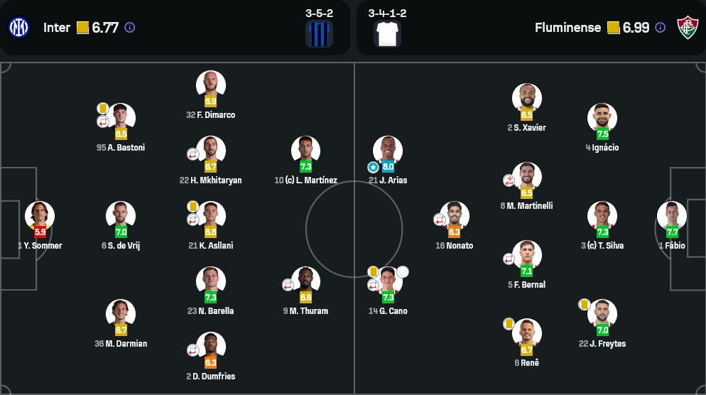 เกมนี้ อินเตอร์ มาในแผนถนัด 3-5-2 ซึ่งเน้นการเติมเกมจากวิงแบ็คทั้งสองฝั่ง ดิมาร์โกและดุมฟรีส์ขึ้นสุดลงสุดตลอดทั้งเกม แต่อีกจุดที่เป็นปัญหาคือแดนกลางของพวกเขาซึ่งแม้จะครองบอลได้มากถึง 69% และผ่านบอลแม่นยำถึง 87% แต่ก็ไม่สามารถเจาะแนวรับที่เป็นระเบียบของฟลูมิเนนเซ่ได้เลย ขณะที่ ฟลูมิเนนเซ่ ใช้แผน 3-4-1-2 ที่ปรับเป็นรับลึกเวลาตั้งเกม ตั้งรับต่ำในแดนตัวเองพร้อมใช้ความเร็วของ อารีอัส และความแข็งแกร่งของ กาโน่ เล่นโต้กลับ ซึ่งก็ทำได้เฉียบคม โดยเฉพาะการตัดบอลแล้วเปลี่ยนจากรับเป็นรุกเร็ว ถือเป็นเกม วิเคราะห์บอล ที่ทีมจากบราซิลเตรียมแผนมาได้แม่นยำมาก