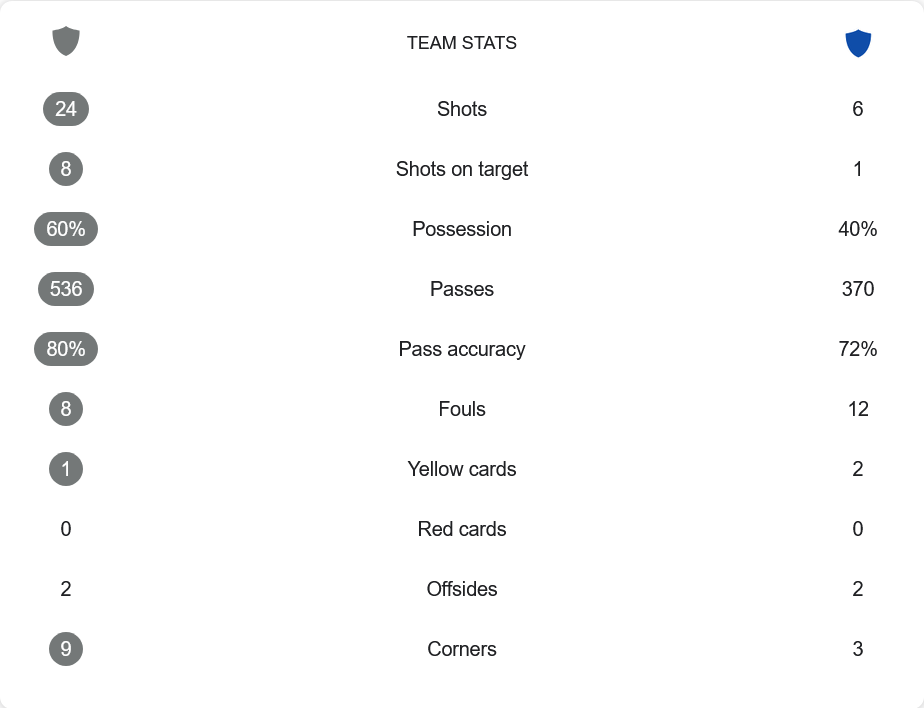 บรานน์เป็นฝ่ายครองบอล 60% ต่อ 40% ของซานเดฟยอร์ด และผ่านบอลไปถึง 536 ครั้งด้วยความแม่นยำ 80% สวนทางกับทีมเยือนที่มีเพียง 370 ครั้งและแม่นยำ 72% จำนวนการยิงของเจ้าถิ่นมากถึง 24 ครั้ง เข้ากรอบ 8 หน เทียบกับซานเดฟยอร์ดที่ได้ยิงเพียง 6 ครั้งและตรงกรอบแค่ 1 ครั้งเท่านั้น ในแง่ของลูกตั้งเตะ บรานน์ได้เตะมุมถึง 9 ครั้ง ชัดเจนว่าทำเกมบุกต่อเนื่อง ขณะที่เรื่องฟาวล์ใกล้เคียงกันแต่ซานเดฟยอร์ดโดนไปถึง 2 ใบเหลือง เทียบกับ 1 ใบของเจ้าถิ่น