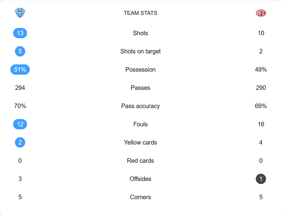 แม้เปอร์เซ็นต์ครองบอลจะสูสีกัน เปซานดู 51% และเฟอร์โรเวียเรีย 49% แต่ในเรื่องการเข้าทำ ทีมเจ้าบ้านมีความอันตรายกว่า ชัดเจนจากการยิง 13 ครั้ง เข้ากรอบ 5 หน เทียบกับเฟอร์โรเวียเรียที่ยิง 10 ครั้ง ตรงกรอบเพียง 2 หน การผ่านบอลและแม่นยำอยู่ใกล้เคียงกัน (เปซานดู 70%, เฟอร์โรเวียเรีย 69%) แต่ฝ่ายหลังมีฟาวล์ถึง 16 ครั้ง และโดนใบเหลืองถึง 4 ใบ ต่างจากเปซานดูที่มีเพียง 2 ใบ เป็นอีกหนึ่งตัวชี้วัดถึงความตึงเครียดและความกดดันในฝั่งทีมเยือน