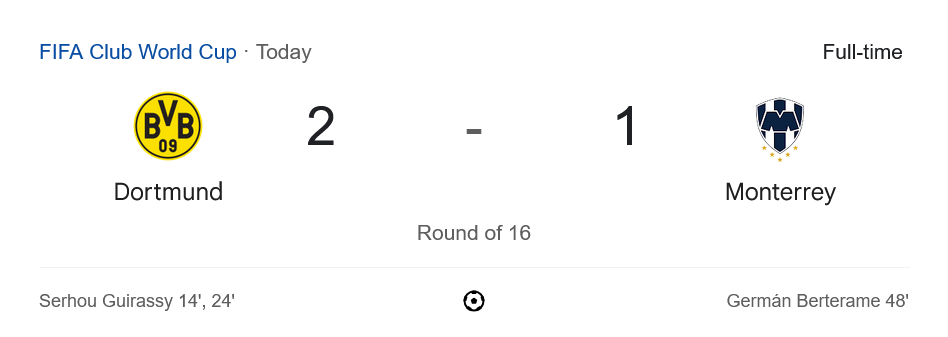 ดอร์ทมุนด์ผ่านเข้าสู่รอบต่อไปของศึกฟีฟ่าคลับเวิลด์คัพอย่างยอดเยี่ยม โดยจะต้องเจอกับเรอัล มาดริดในรอบถัดไป เป็นเกมที่แฟนบอลทั่วโลกตั้งตารอ ขณะที่มอนเตอร์เรย์แม้จะแพ้แต่ก็ได้รับคำชื่นชมเรื่องรูปแบบการเล่น และสามารถโฟกัสต่อในลีกเม็กซิโกได้ทันที