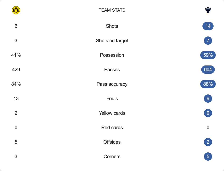 แผนของ ดอร์ทมุนด์ ในเกมนี้คือ 3-5-2 ที่เน้นการเคลื่อนที่ของฟูลแบ็กและการสอดขึ้นของกองกลาง จุดเด่นคือเกมรุกที่รวดเร็วและเฉียบคม โดยเฉพาะการประสานงานระหว่าง กีราสซี่ และ อเดเยมี่ ที่เล่นกันได้อย่างลงตัว การสวนกลับก็อันตรายทุกครั้งจากการทะลุช่องของกรอสส์ ขณะที่แผงหลังแม้จะไม่ครองบอลเยอะ แต่การตั้งรับในแดนตัวเองก็ทำได้แข็งแกร่ง