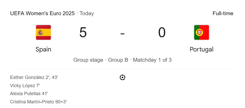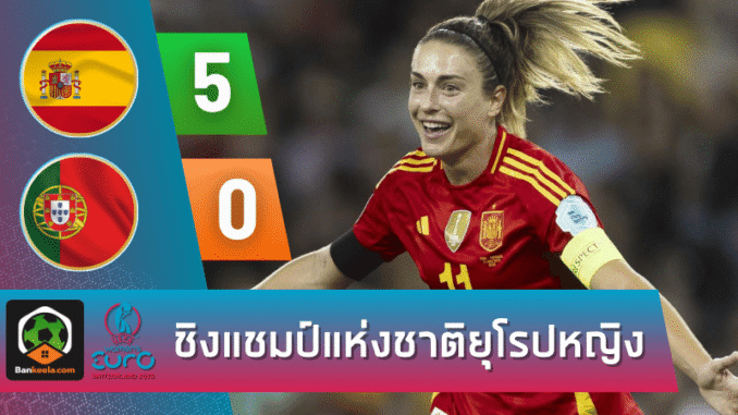 ศึกฟุตบอลชิงแชมป์แห่งชาติยุโรปหญิง 2025 รอบแบ่งกลุ่ม กลุ่ม B นัดแรกเมื่อคืนที่ผ่านมา สเปน(ญ) โชว์ฟอร์มโหดสมราคาเต็ง ไล่ขยี้โปรตุเกส(ญ) ขาดลอย 5-0 แบบไม่ไว้หน้า บ้านกีฬา เกาะติด ผลบอลสด แบบนาทีต่อนาที รายงานกันแบบถึงใจแฟนบอล