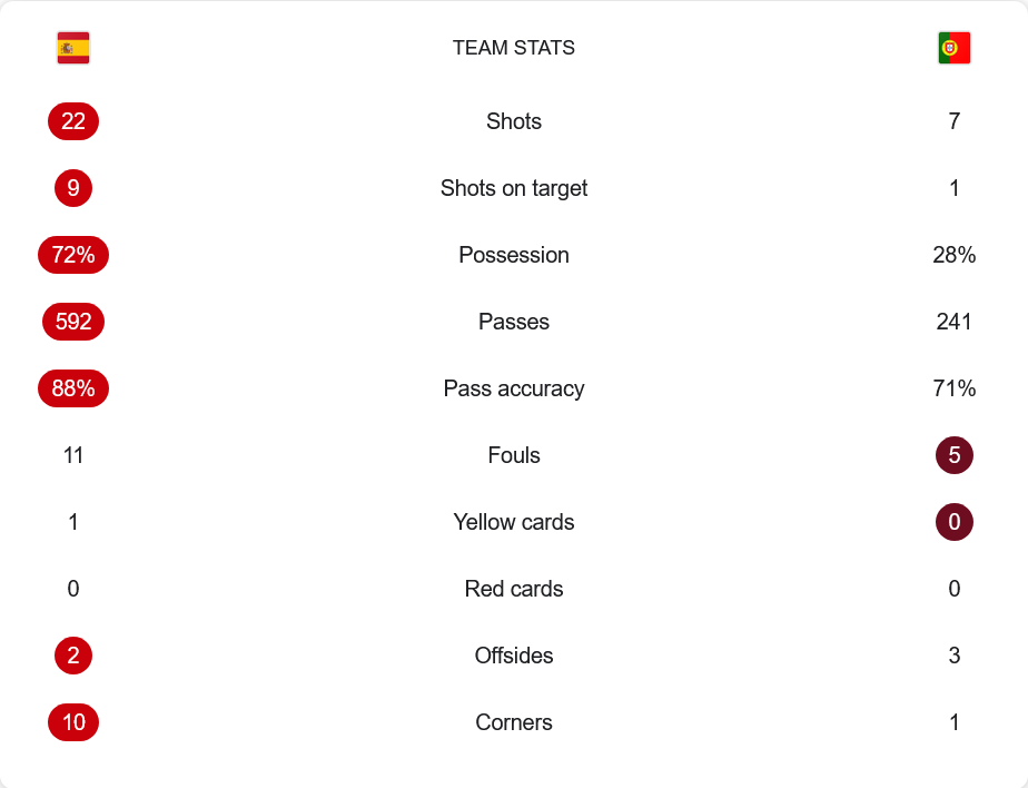 สเปนครองบอลมากถึง 72% ต่อ 28% ของโปรตุเกส จ่ายบอลสำเร็จถึง 88% เทียบกับ 71% ของโปรตุเกส สเปนยิงทั้งสิ้น 22 ครั้ง เข้ากรอบ 9 ขณะที่โปรตุเกสยิงแค่ 7 ครั้ง เข้ากรอบเพียง 1 นอกจากนี้สเปนได้เตะมุมถึง 10 ครั้ง ขณะที่โปรตุเกสได้แค่ครั้งเดียว