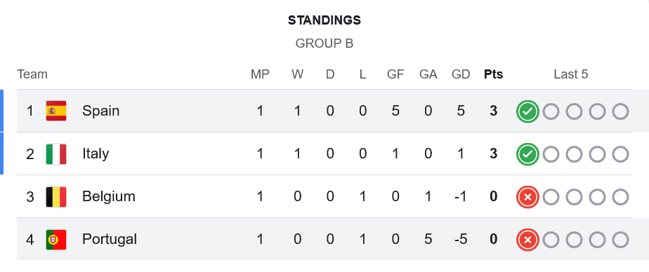 ชัยชนะเกมนี้ทำให้สเปนขึ้นนำกลุ่ม B ด้วย 3 คะแนนเต็ม ลูกได้เสีย +5 เท่ากับอิตาลีที่ชนะเบลเยียม แต่ประตูได้มากกว่า จึงรั้งจ่าฝูงของกลุ่ม ส่วนโปรตุเกสจมบ๊วยหลังโดนยิงไปถึง 5 ลูก