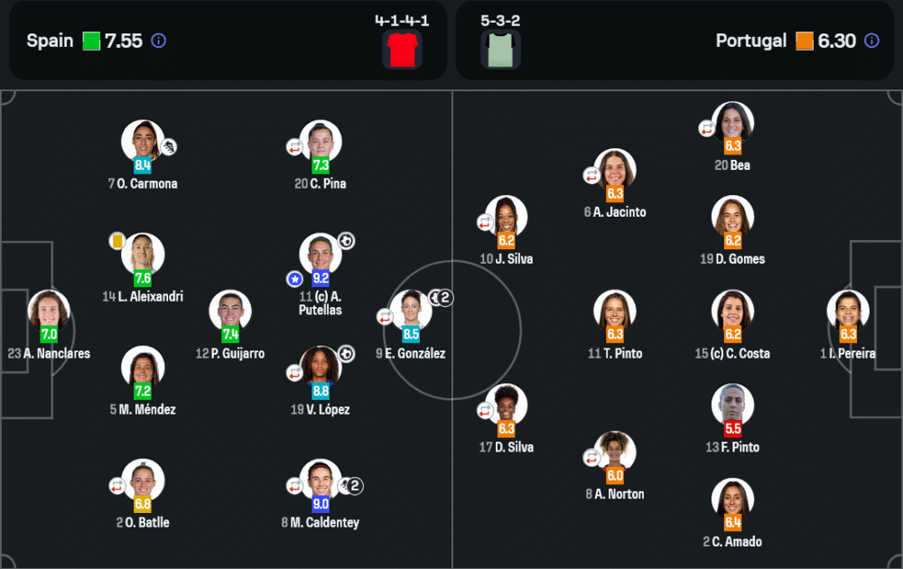 กองหลัง: โอลก้า คาร์โมน่า (8.4), ลาอา อเล็กซานดรี (7.6), มาร์ต้า เมนเดซ (7.2), โอน่า บัตเย่ (6.8)