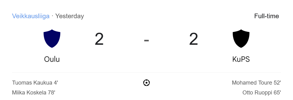 ศึกไวเคาส์ลีกา ฟินแลนด์ เมื่อคืนที่ผ่านมา บ้านกีฬา เกาะติดรายงาน ผลบอลสด แบบนาทีต่อนาที เอซี โอลู ทีมรองบ๊วยของตาราง เปิดบ้านไล่ตีเสมอ คูพีเอส ทีมจ่าฝูงไปแบบสุดมัน 2-2 หลังต้องเป็นฝ่ายตามหลังถึงสองครั้ง เกมนี้เต็มไปด้วยจังหวะดุเดือด การเข้าปะทะและความกดดันสูงตั้งแต่นาทีแรกจนจบ