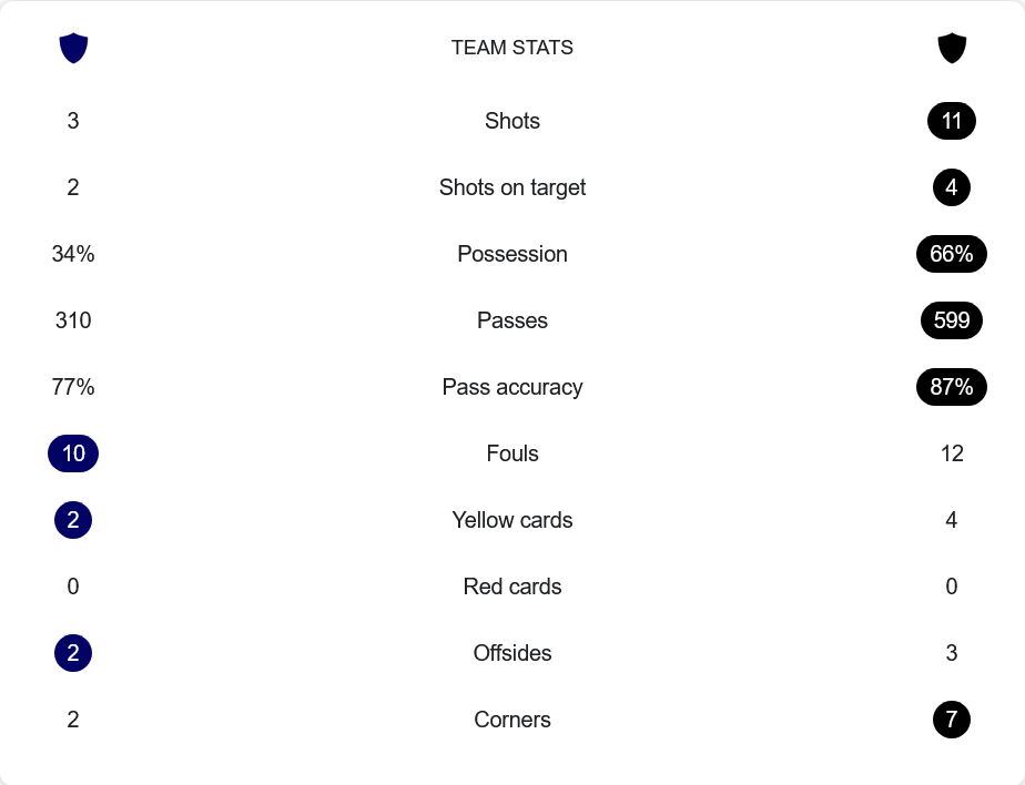 แม้โอลูจะยิงเพียง 3 ครั้งเข้ากรอบ 2 ครั้ง แต่กลับได้ถึง 2 ประตู ขณะที่คูพีเอสครองบอลถึง 66% ยิงรวม 11 ครั้งเข้ากรอบ 4 ครั้ง เกมนี้คูพีเอสผ่านบอลมากถึง 599 ครั้งแม่นยำถึง 87% เทียบกับโอลูเพียง 310 ครั้งแม่นยำ 77% จังหวะฟาวล์ทั้งสองฝั่งหนักหน่วงไม่แพ้กันรวมกว่า 22 ครั้ง และมีเตะมุมรวม 9 ครั้งตลอดทั้งเกม